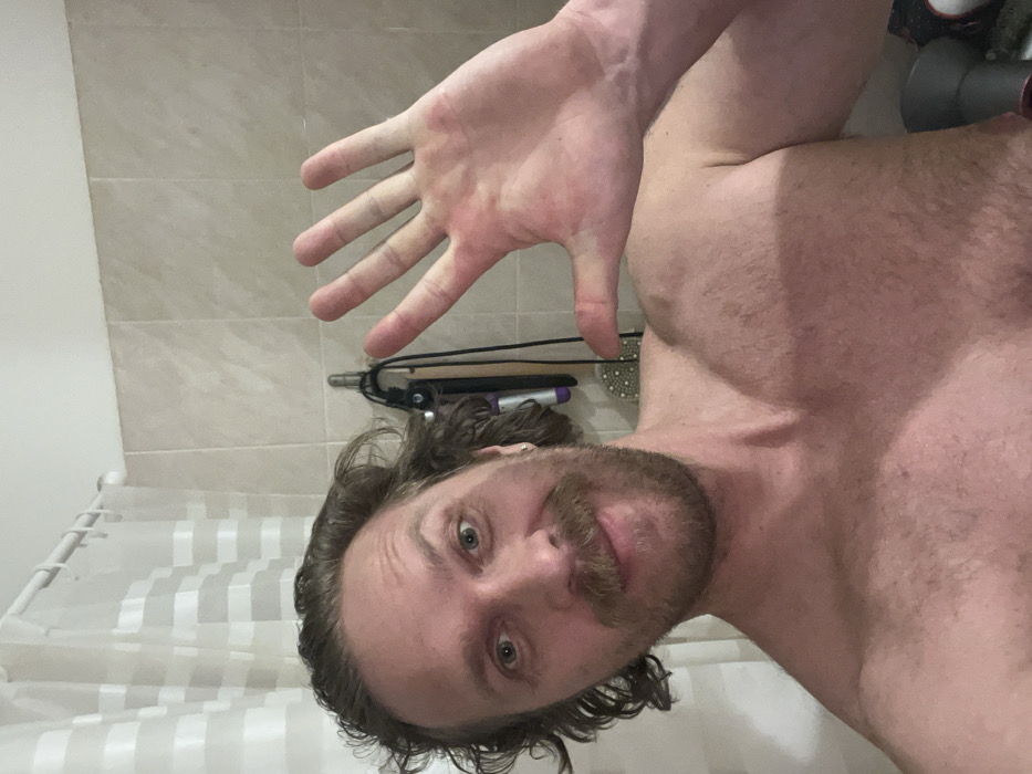 A shirtless man with a beard and shoulder-length curly hair faces the camera. He holds up his right hand, palm facing forward. In the background, there's a tiled wall, a shower curtain, and a countertop with hair styling tools and accessories. The image appears to be taken in a bathroom. The man is slightly off-center. The entire scene is brightly lit.