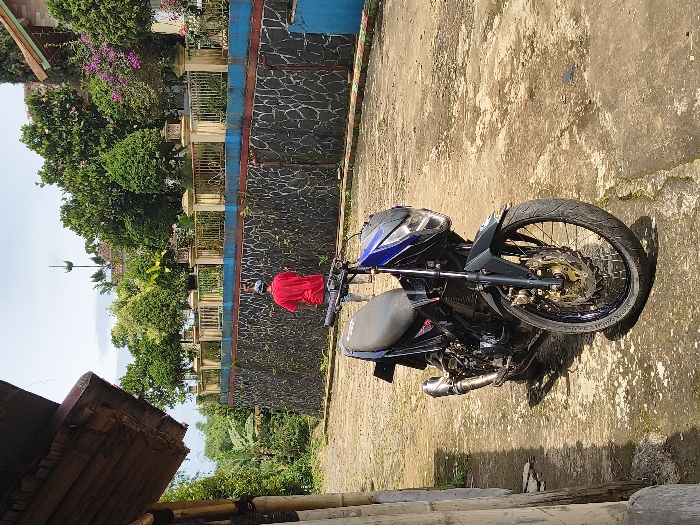 A motorcycle is parked on a concrete surface beside a stone wall, with a person in a red shirt standing next to it. In the background, there's a view of lush green trees, a building, and other structures, suggesting a residential or park area. The foreground also includes a glimpse of a wooden structure, perhaps a part of a building or fence.