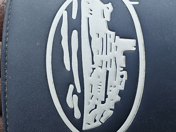 A close-up photograph captures a light-colored, stylized emblem positioned on a dark, textured surface