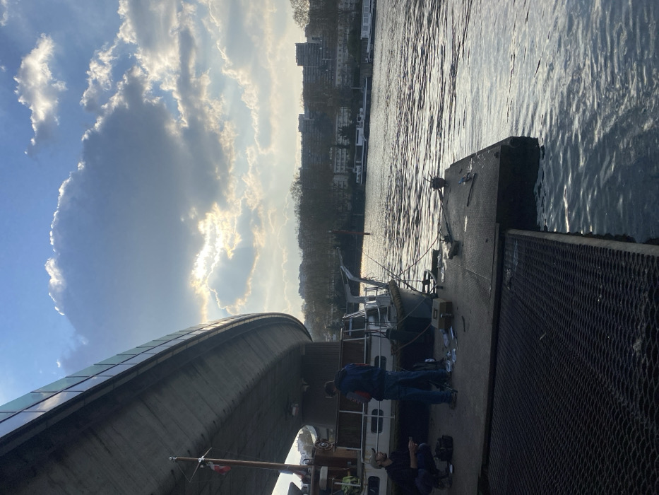 The image depicts a river scene in Boulogne-Billancourt, France. A large, curved concrete overpass or bridge, with a glass-paneled barrier along its upper edge, dominates the upper left quadrant of the frame. Beneath this structure, on a concrete pier, two adult males are present. The man on the left is crouched, wearing a dark cap, a dark jacket, and dark pants, with a beard visible. He appears to be attending to something on the pier surface, possibly a small bag located beside him. The second man stands centrally, dressed in a dark blue jacket, blue jeans, and dark shoes, facing towards the river or a docked vessel. A grey-hulled motorboat with a white superstructure is moored alongside the concrete pier, positioned directly under the bridge. Several fishing rods are visible, extending from the boat or propped near it. Various items, including a light brown metallic tackle box, are scattered on the pier next to the boat, indicating active or recent fishing. Further under the bridge, a larger vessel, possibly a houseboat or cabin cruiser, is partially visible, featuring a small mast with a red-and-white flag. The foreground includes a dark, metal-gridded platform transitioning into the concrete pier. The river water exhibits ripples and reflects the sky, appearing luminous. The sky is partially covered by cumulus clouds, with the low sun obscured but producing a bright glare from behind the clouds in the upper right quadrant. The distant opposite bank of the river displays a line of bare trees, behind which a collection of multi-story urban buildings is visible. Other boats are moored further downstream on the river. The overall lighting suggests late afternoon or early evening.