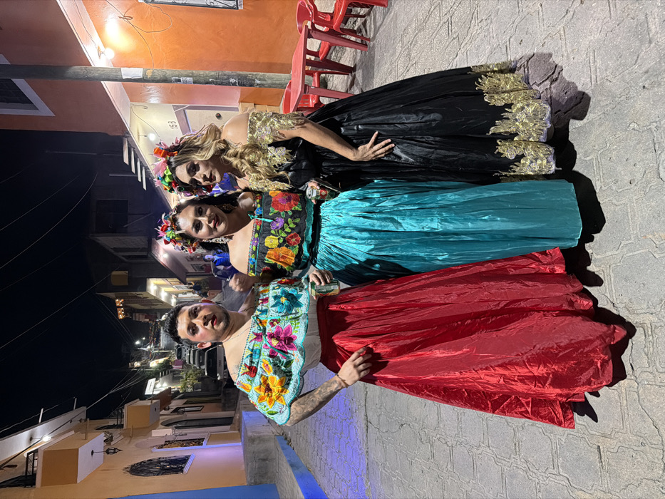 Three individuals in vibrant traditional Mexican dresses pose on a dimly lit street