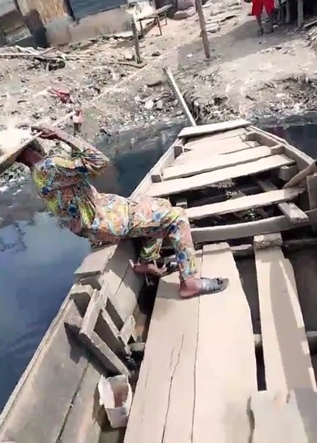 A man wearing a wide-brimmed hat and colorful patterned clothing is seen in a small wooden boat. He is using a white pole to pull the boat along a narrow waterway. The waterway is littered with trash and debris on the banks. The boat appears to be homemade. There are buildings and other people visible in the background. The man is barefoot and wearing sandals. He is leaning out over the side of the boat.