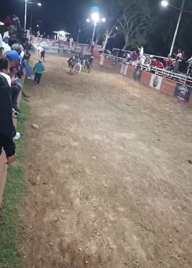 The scene captures an outdoor rodeo event during nighttime