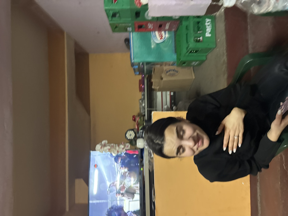The scene depicts an indoor setting, likely a casual living or storage area, in Gorna Grashtitsa, Bulgaria. A female individual with dark hair, wearing a black long-sleeved top and dark pants, is seated in a green plastic chair in the foreground, angled towards the right. Her eyes are partially closed, and she displays a smiling or laughing expression, with her left hand placed on her chest, revealing a ring on her ring finger. She holds a white smartphone in her right hand. To her left, a large flat-screen television displays an image of multiple individuals holding cameras or phones, possibly at a concert or event. A white, floral-like decorative string hangs vertically to the right of the television. Behind the woman and extending to the right, the room contains various objects: multiple green plastic crates are stacked, some bearing the word "Party," alongside red plastic crates and cardboard boxes. A light blue or greenish refrigerator or cooler, partially obscured, shows the word "Nestle." A circular light fixture is visible on a surface behind the television. The walls are painted a distinct yellow-orange on the left and a light pinkish-purple on the right. The ceiling is a beige color with visible beams. The floor is dark, with reddish-brown areas. A plastic water bottle and a pink object are visible in the immediate right foreground.