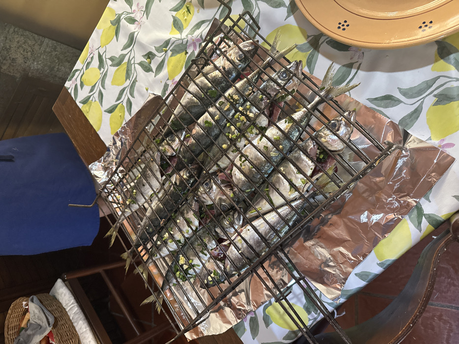 The image depicts an indoor scene in Cutrofiano, Italy, focusing on a preparation of fish for cooking. At the center, a black wire grilling basket holds approximately twenty to twenty-five whole, descaled, and eviscerated small to medium-sized, elongated, silvery fish. The fish are visibly seasoned with finely chopped green herbs and white specks, consistent with parsley and garlic, placed within their cavities and on their skin. The grilling basket rests on a crumpled sheet of silver aluminum foil, which in turn lies on a wooden table. The wooden table is partially covered by a white tablecloth featuring a pattern of yellow lemons, green leaves, and scattered pink blossoms. To the upper left, a wooden chair is visible, supporting a woven basket containing folded grey textiles and several red spherical objects, likely produce. In the upper center-right background, a person's lower torso and legs are partially visible, clad in a dark blue garment, possibly an apron or work attire. To the right of the fish, a segment of an orange-brown ceramic plate with a decorative border of dark dots is visible. The floor beneath the table and chair is composed of reddish-brown tiles.