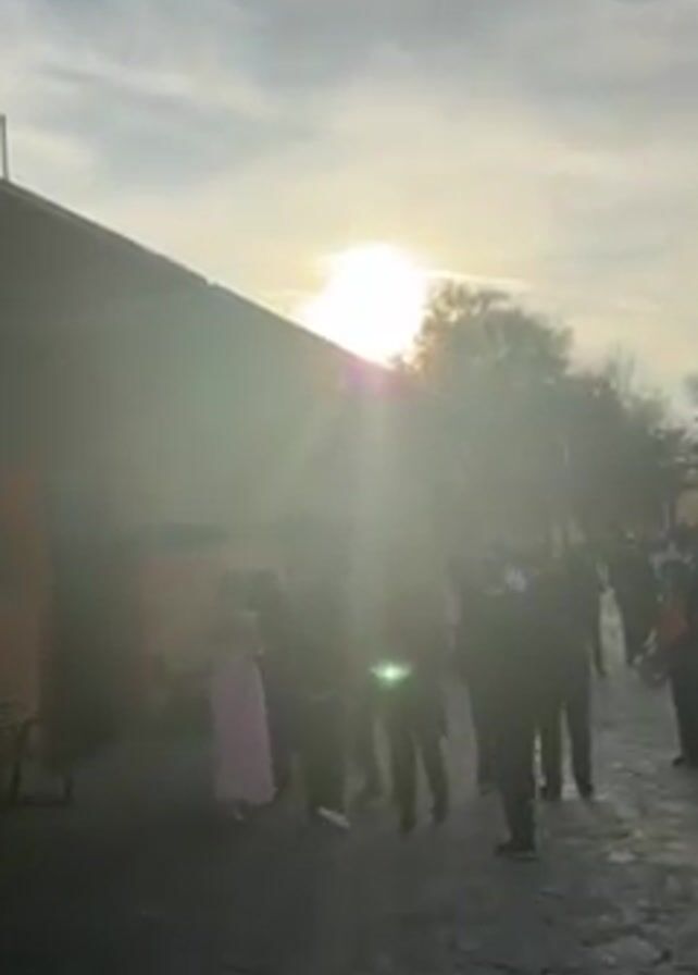 A group of people stand outside a building with the sun shining brightly behind it. A woman in a pink dress stands with some of the people. The ground is paved with stones. The sky is bright and hazy. There are trees in the background.