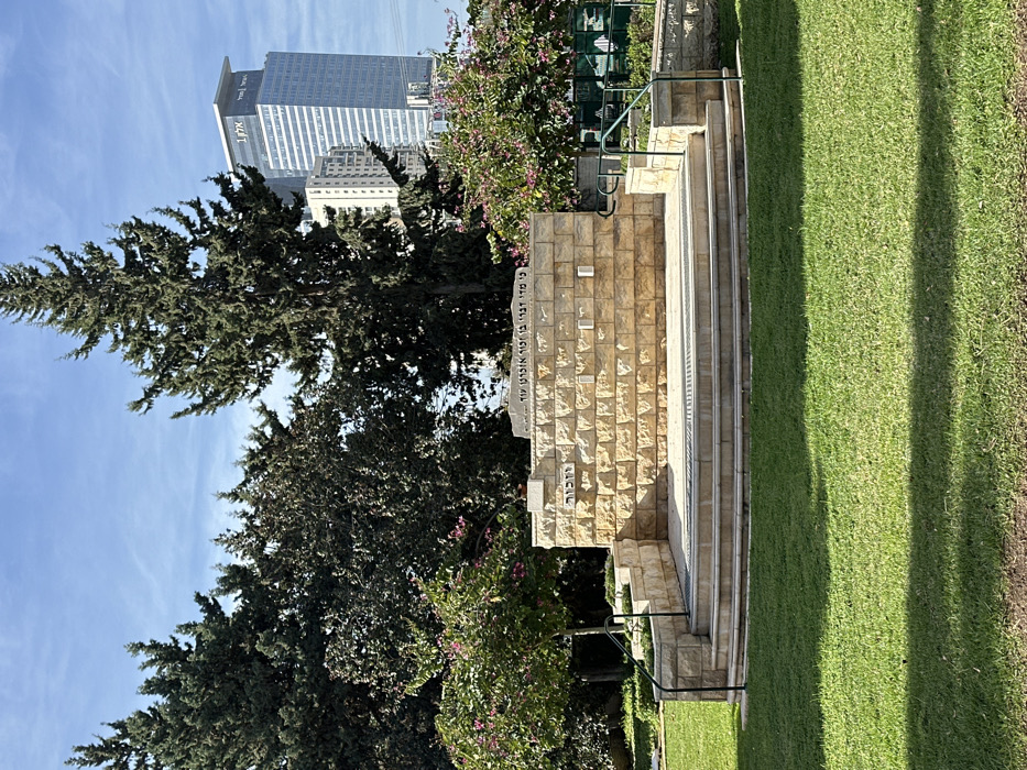 A stone memorial stands adjacent to a grassy lawn with trees and foliage surrounding it. The memorial features a stone wall with Hebrew text. In the background, a modern skyscraper towers above the treeline under a clear blue sky. The photograph is taken outdoors on a sunny day, capturing shadows on the grass.