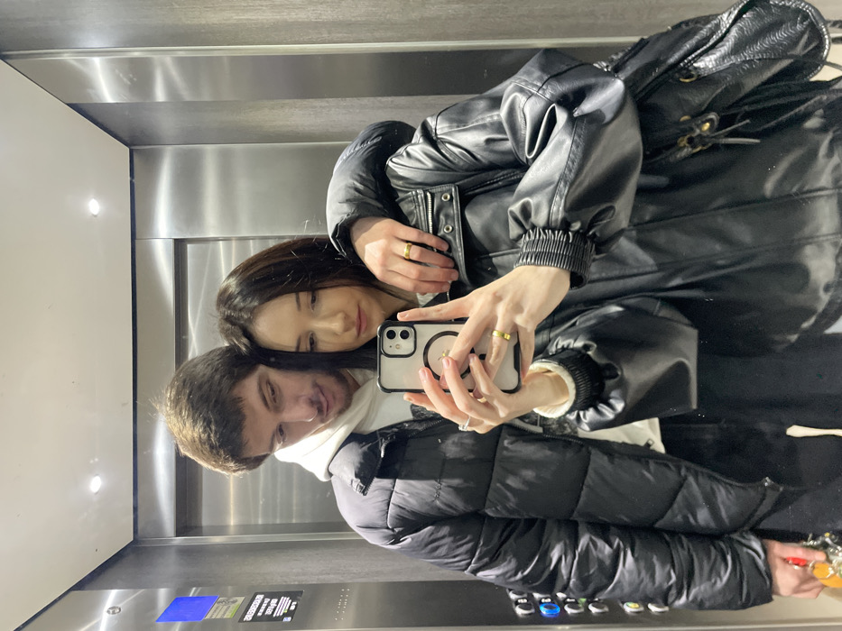 This image captures two individuals, a male and a female, inside an elevator located in Cachan, France. The female, positioned in the foreground and slightly to the right, has dark, shoulder-length hair and is wearing a black leather-style jacket over a light-colored long-sleeve top. She holds a white smartphone with a visible black MagSafe accessory in her left hand, appearing to take a mirror selfie. She wears a gold-colored ring on her left ring finger and another on her left middle finger. A black textured shoulder bag with brass-colored hardware is visible on her right side, partially obstructed. The male stands behind and slightly to the left of the female. He has brown, medium-length hair and is wearing a white hooded sweatshirt under a black puffer jacket. His right arm is draped over the female's left shoulder/upper arm. He wears a gold-colored ring on his right ring finger. His left hand, visible at the bottom left of the frame, holds a set of keys with a yellow and orange keychain. The elevator interior features reflective surfaces, likely polished metal or mirrors, on its walls, reflecting the subjects and various elements of the cabin. On the left wall, an elevator control panel is visible with a blue illuminated indicator at the top, indistinct text below it, and a column of circular buttons, some illuminated blue. A single recessed light fixture is visible on the ceiling. The scene is illuminated by artificial light sources within the elevator.