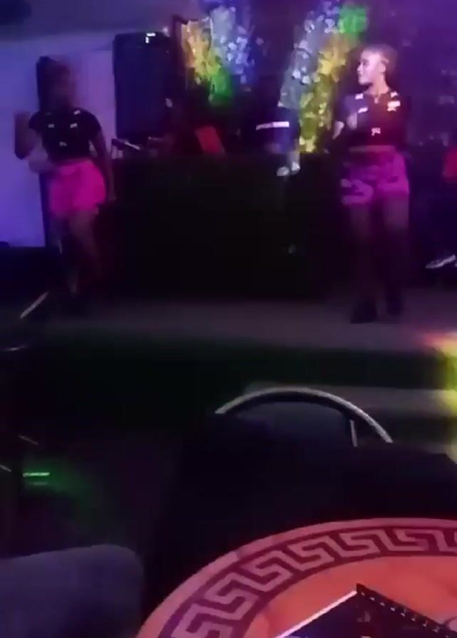 two women dancing on a stage in what appears to be a nightclub or outdoor lounge. They are wearing black tops and bright pink shorts. There is a DJ booth behind them. The camera is positioned at a table with a menu. There are also other tables and chairs in the foreground. The lighting in the establishment is dark, with colored lights illuminating the stage and the dancers. The overall atmosphere suggests a party or entertainment setting.