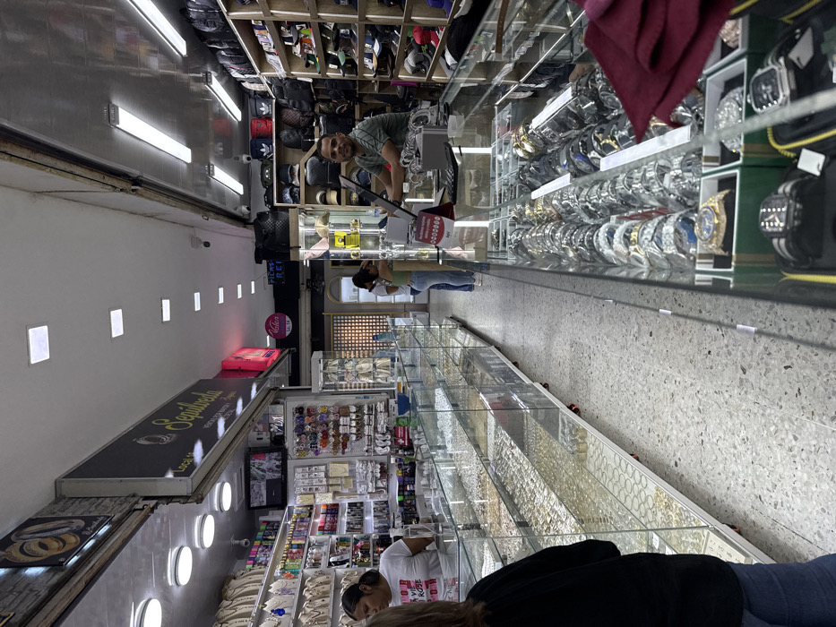 The image depicts an interior view of a retail corridor or shopping gallery within Perimetro Urbano Pereira, Colombia. The environment is brightly lit by numerous square recessed and linear fluorescent lights on a white ceiling, above a speckled terrazzo floor. Along the left side, extending into the background, are multiple glass display cases filled with various jewelry items, predominantly rings, necklaces, and bracelets in gold and silver tones. Behind these cases, a store sign reads "Sepulveda" (Local 56) with a dark background and white lettering. Inside this store, a female individual in a white t-shirt, with "LIVE VIBRANT ROSE" partially visible on the front, stands behind a counter, facing right. Shelves behind her display more accessories and jewelry. Further back on the left, a storefront sign for "Valen" (Local 14) is visible with pink neon lighting above. A person in a dark top and blue jeans is partially visible in the left foreground, with their back to the camera. On the right side, extending from the foreground, are glass display cases containing numerous watches, mostly metallic, arranged in rows. A red cloth is partially visible on the leading edge of the front display case. Behind these cases, a male employee with a slight beard, wearing a green patterned short-sleeve shirt, stands behind a counter with a black point-of-sale system and smiles directly at the camera. Behind him, shelving units are stocked with various backpacks, including some with the Adidas logo, and numerous caps or hats. Further into the background on the right, another store entrance features a patterned wooden or metal gate. Two female individuals are visible further back, one in a light green top and jeans, partially obscured by display units, appearing to interact near the gate. Multiple surveillance cameras are visible mounted on the ceiling throughout the corridor.