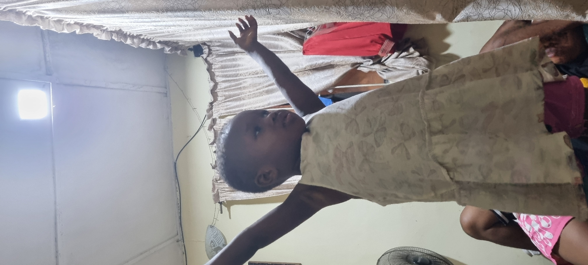 A young child with dark skin and short, curly hair is wearing a light-colored floral dress and standing with both arms raised. The child appears to be indoors. In the background, there are beige curtains, a white wall, and a visible bright light fixture on the wall. A person’s legs wearing patterned shorts, and a red bag are in the background as well. Two floor fans are on the ground. The location appears to be a domestic setting, potentially in Ikeja, Nigeria, given the reference to that location.