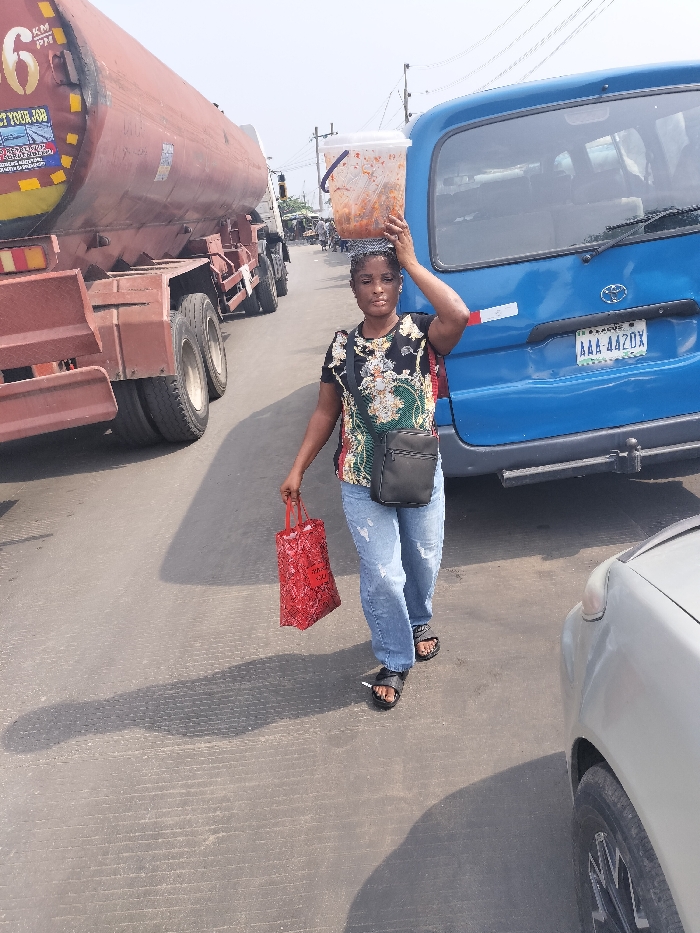 An adult female walks forward on a gray paved road in Lagos, Nigeria