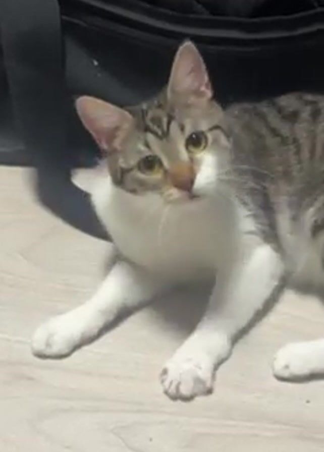 - "A tabby and white cat lies on its side on a light-colored wooden floor, near a black bag" by FM-r8nDs2, licensed under CC BY 4.0
