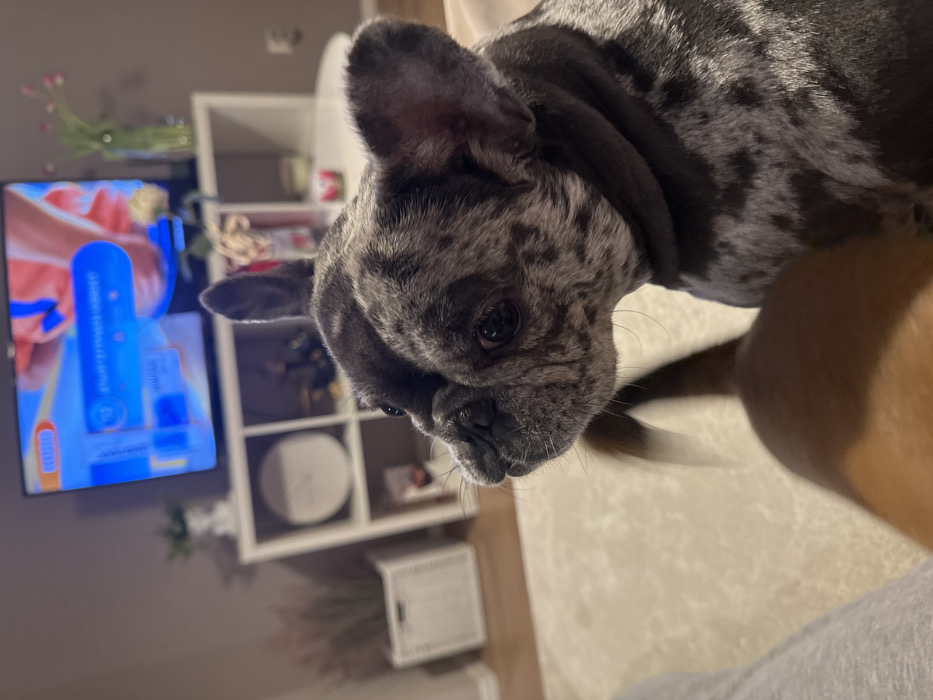 This image depicts an interior residential scene in the city of Sofia, Bulgaria. The primary subject is a merle French Bulldog, positioned in the mid-right of the frame, captured in profile and looking left. The dog exhibits a mottled gray and black coat, with erect ears and a visible eye. In the immediate foreground, a portion of a second, brown-colored dog is visible in the lower-center, with its tail blurred, indicative of movement. A human leg, dressed in light gray fabric, occupies the lower-left corner. The background features a wall-mounted flat-screen television displaying a vibrant, primarily blue and red graphic with unreadable text. Below the television, a white, cubby-style shelving unit holds various decorative items, including a white circular object, a small potted plant, a vase containing pink flowers, and other indistinct objects. A light-colored carpet covers the floor. In the distant left, a white woven basket containing tall, dried ornamental grasses is visible. The walls are a neutral, light gray tone. The scene is illuminated by ambient indoor light.