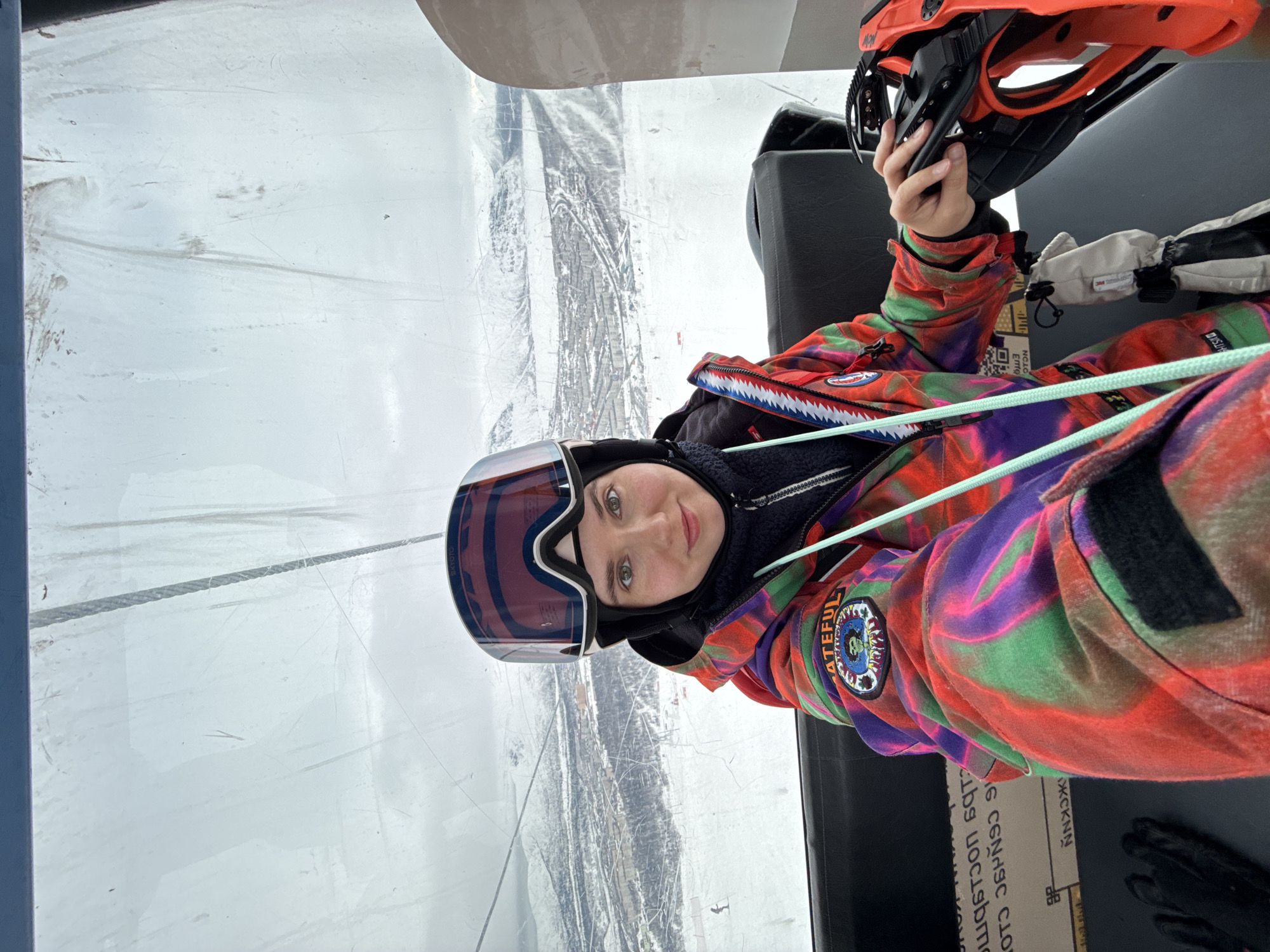 A female subject is depicted in a selfie taken inside a gondola cabin, positioned above Kirovsk, Russia. She wears a multi-colored ski jacket with red, green, and purple patterns, a black balaclava, and ski goggles resting on her forehead. Her face shows light-colored eyes and a subtle smile. Her right hand holds an orange and black snowboard binding, with the snowboard itself partially visible to her right. A light-colored glove with a 3M Thinsulate tag hangs from her jacket, and a black glove is visible on a surface to her left. The gondola's window, showing scratches and smudges, overlooks a snow-covered mountainous landscape. Below, the city of Kirovsk is visible with its buildings and road networks, extending towards a large, snow-dusted body of water, likely Lake Bolshoy Vudyavr, surrounded by further snow-covered peaks under an overcast sky.