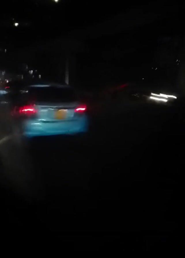 nighttime scene from inside a moving vehicle. The camera is somewhat unstable, resulting in blurred images. In the initial frame, the taillights of a light-colored car are visible. As the video progresses, the focus shifts to the road ahead, where several sets of blurred lights can be seen, likely from other vehicles. The environment is generally dark, typical of a night drive. There are no people visible in the video. The only actions are the movement of the vehicles on the road and the shaky movement of the camera.