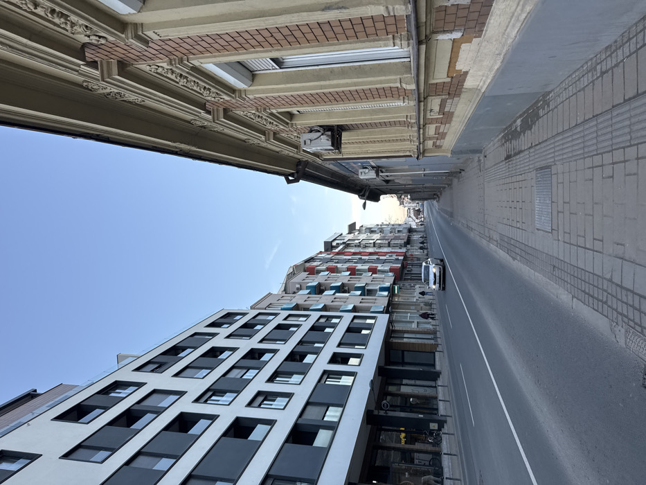 An upward-angled view of a city street. A modern building with large, rectangular windows flanks the left, while older, ornate structures line the right, with a sidewalk composed of gray bricks. An asphalt road stretches between them, marked with a white line. A white car travels down the road, appearing small in the distance. A clear blue sky dominates the upper left, contrasting with the buildings.