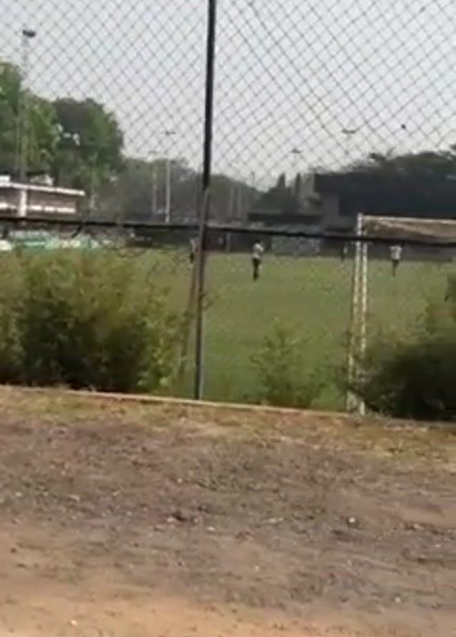 The video is shot from behind a chain link fence, and shows a green sports field with people walking and standing on it
