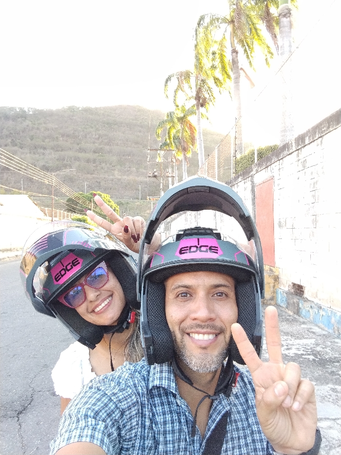 - "A couple wearing helmets flashes peace signs while riding a motorcycle" by FM-qNIlA2, licensed under CC BY 4.0