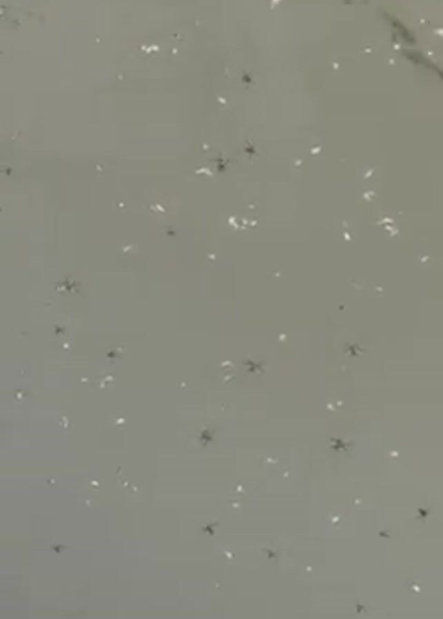 body of water teeming with small, dark insects, likely water striders, rapidly moving across the surface