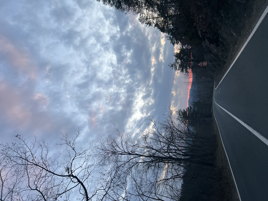 The image depicts a rural mountainous road at what appears to be sunset in Svetulka, Bulgaria. A two-lane asphalt road curves gently to the right and recedes into the distance, marked with a solid white line on the right edge and a broken white center line. The sky overhead is largely overcast with grey-blue stratocumulus clouds, exhibiting patches of pink and orange coloration, particularly low on the horizon where a distinct band of intense red-orange light is visible above distant hills. To the left, a dense cluster of bare deciduous trees, indicative of winter, lines the roadside. To the right, a steep, rocky embankment is covered with coniferous trees (pines). Two road signs are present on the right shoulder: an upper triangular warning sign with a red border depicting uneven road, and a lower circular regulatory sign with a red border indicating a "40" km/h speed limit. No individuals or vehicles are present in the scene.