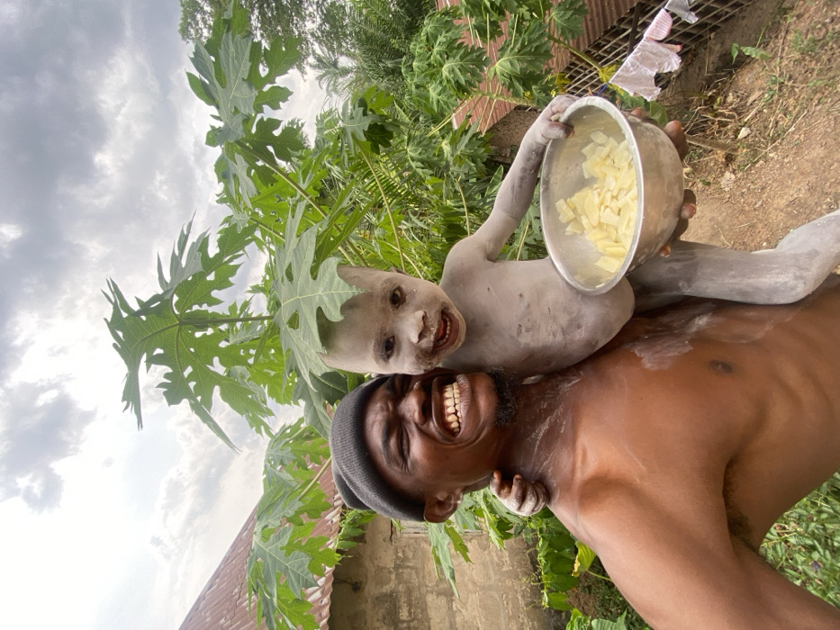 An adult male with a dark complexion, wearing a dark beanie and no shirt, holds a young child. The man exhibits an exaggerated, wide-mouthed smile, showing his teeth, and has visible light grey/white powder on his left shoulder, neck, and chest. The child, also with a dark complexion, is entirely covered in the same light grey/white powder, from face to visible limbs, and is smiling with an open mouth. The child's right arm is around the man's neck. In the child's left hand is a silver-colored bowl containing numerous small, irregularly shaped, light-yellow food items. Both individuals are looking directly towards the camera. The scene is outdoors in Ufueseni, Nigeria, under an overcast sky. Directly behind the subjects is a prominent papaya tree with large, segmented green leaves. To the left, a light-colored building wall and a corrugated metal roof are visible. To the right, in the background, a clothesline with white garments hangs near a fence-like structure. The ground beneath the subjects appears to be dirt.