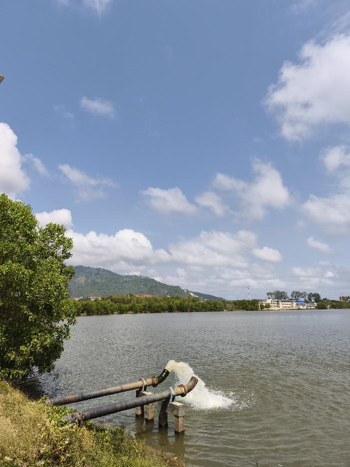 A wide shot captures a body of water, likely a lake, beneath a blue sky dotted with fluffy white clouds. Two large pipes extend into the water, gushing streams of water. Lush greenery lines the edge of the water on the left side. In the distance, a building complex and a tree-covered hill rise above the horizon. The water surface is generally calm.
