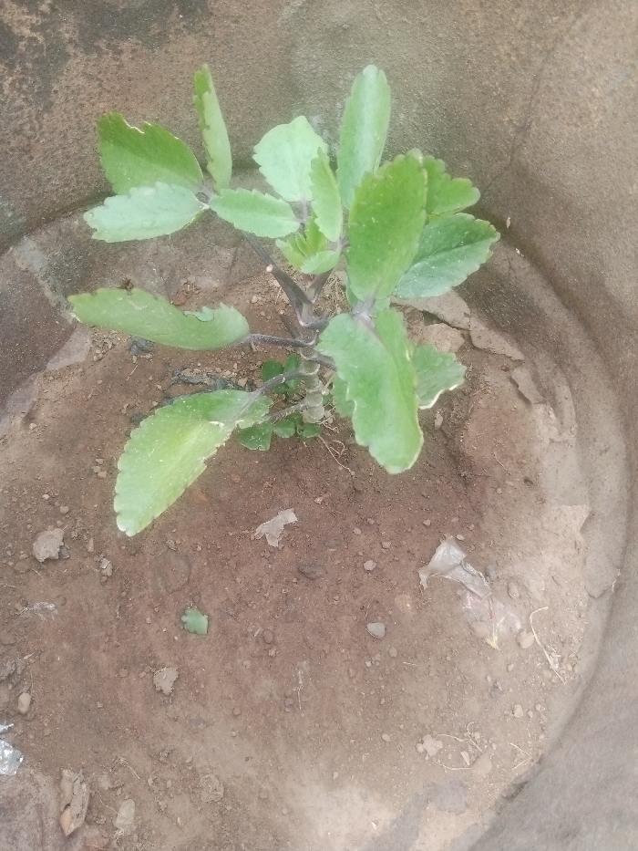 - "A single small plant, approximately 20-25 cm in height, with a branched central stem and numerous light green, ovate leaves exhibiting undulate or scalloped margins, is situated centrally within a round, unglazed, light brown-grey concrete pot" by FM-ek8BD3, licensed under CC BY 4.0