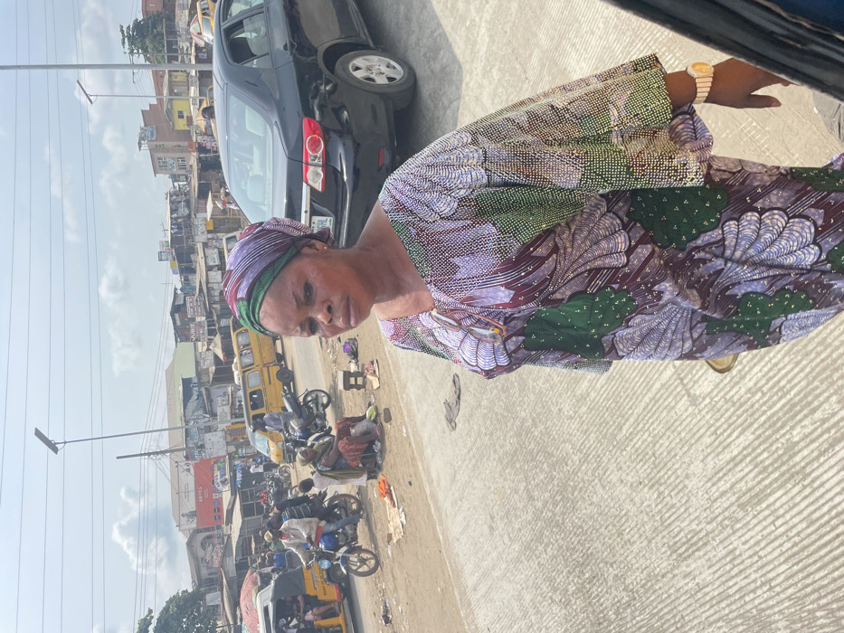 A daylight street scene in Agbara, Nigeria, shows a woman in the foreground looking slightly left of the camera