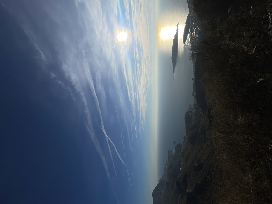 A panoramic landscape photograph taken from an elevated position in Brajici, Montenegro, depicts the Adriatic Sea and its coastline. The bright sun is positioned in the upper right, casting an intense, vertical golden-white reflection across the calm sea surface. The sky is clear blue, darkening towards the upper left, and contains multiple white contrails, two of which intersect prominently in the upper left quadrant. Scattered thin clouds are also visible, particularly around the sun. The left side of the image features a dark, rugged mountain range covered in sparse vegetation, sloping down towards the sea. Several coastal settlements with visible buildings are nestled along this shore. In the mid-right, the elongated, dark landmass of Sveti Nikola Island is visible, situated opposite the urban development of Budva city along the bay. The immediate foreground consists of dark, silhouetted scrub vegetation on a sloping hillside. No human subjects, animals, or specific actions are present in the frame.