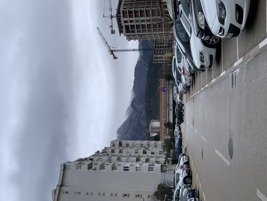 The image depicts an urban street scene in Bjeliši, Montenegro, under an overcast sky with a mountainous backdrop. In the foreground and midground, a wet asphalt parking area is visible, marked with white lines defining parking spaces. Numerous passenger vehicles of various makes, models, and colors are parked on both sides of a central roadway. On the left, a row of predominantly white multi-story residential buildings with balconies extends into the background. On the right, a multi-story building constructed of concrete frame is under active construction, with two yellow tower cranes positioned adjacent to it. In the middle distance, a black SUV is observed reversing in the central roadway. Further back, between the buildings and the distant mountains, a smaller, light-colored building with a distinctive reddish-brown roof is discernible. A red hexagonal "STOP" sign and a blue square "pedestrian crossing" sign are mounted on a pole near the center of the image. The background features a range of mountains, some covered with green vegetation, while the highest peaks display visible patches of snow. The sky is uniformly gray and heavily clouded, suggesting an overcast day. No individuals are clearly visible in the scene. The overall environment indicates a mix of established residential areas and ongoing urban development.