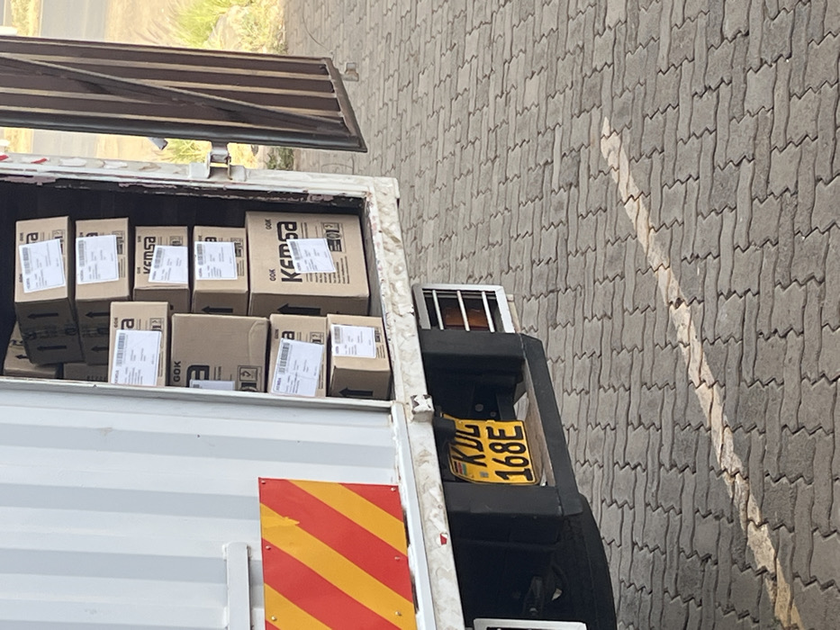 A partially loaded delivery truck has its back hatch open. Brown cardboard boxes, some labeled "KEMSA," fill the cargo space. Each box has a white label. The truck's yellow license plate reads "KDL 168E". A red and yellow striped warning marker is affixed to the truck's exterior. The scene takes place outdoors on a gray tiled surface.
