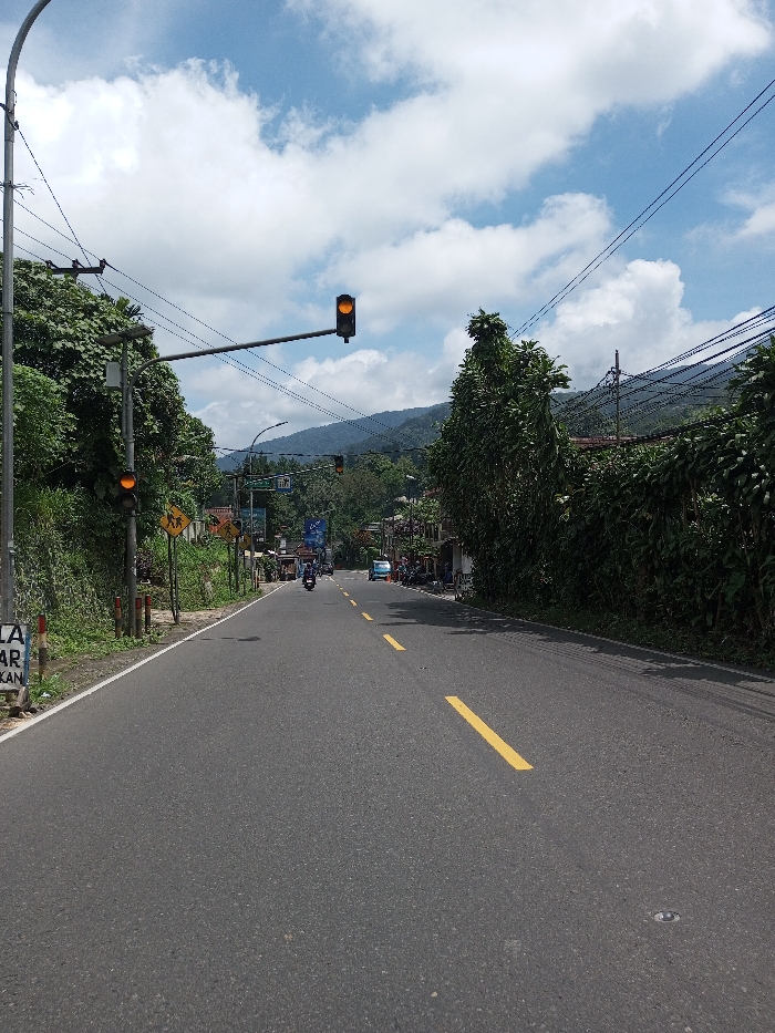This image depicts a street scene in Boommlog, Bhutan, under a partially cloudy sky. The primary subject is an asphalt two-lane road receding into the distance. The road features yellow dashed lines marking the center and a solid white line on the left shoulder. On the left side of the road, a gray utility pole supports multiple overhead wires and a street light with an attached solar panel. A traffic light mounted on an overhead arm displays an amber light, with a second amber traffic light visible further down the road. Green vegetation, including trees and dense bushes, lines both sides of the road. A yellow diamond-shaped sign with black symbols, likely a warning sign, is visible on the left. Further down the road on the left, a blue banner or sign is partially visible amidst buildings. On the right side, lush green foliage and additional utility poles with numerous overhead wires are present. Shadows are cast across the right side of the road. Multiple parked motorcycles/scooters and a light blue van are visible further down the road on the right, near several structures. A single person on a dark-colored scooter travels away from the camera in the left lane. In the background, green, forested mountains are visible beneath the cloudy sky. A reflective road stud is present in the lower right foreground of the pavement.
