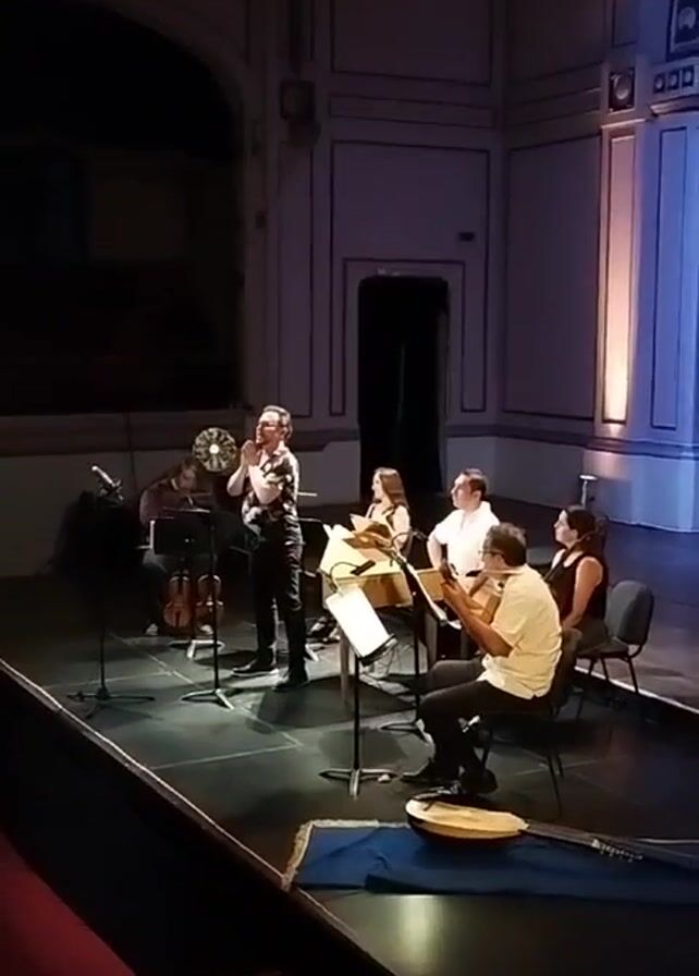 On a stage, a group of musicians rehearses. A man in a black and white floral shirt stands and speaks to the others. He wears glasses and black pants. To his left, a man with long hair sits with a string instrument, and a woman sits next to him. Two men sit opposite, with a woman in a dress seated to the right of them. One of the men plays a string instrument. Music stands are positioned in front of each musician. A long string instrument lies on the floor in front of the stage. The stage is lit by overhead lighting, and there is a large window behind the musicians. The room is ornate with classical architecture.