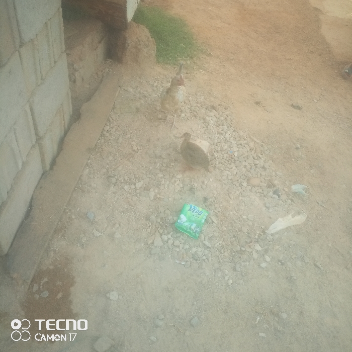 In the city of Unknown, Unknown, an outdoor scene depicts an unpaved area composed primarily of light brown soil and assorted grey and white gravel. To the left, a wall constructed from light grey concrete blocks is partially visible, with a wooden plank running horizontally along its base. Two birds are present on the gravel: an upright, light-colored fowl, possibly a chicken, with a visible red comb and wattle, and a smaller, darker, speckled fowl positioned closer to the foreground. Both birds are standing still. A green packet labeled "Viva" lies flat on the ground in the lower-middle, with a crumpled white plastic item situated further to its right. A dark, possibly damp, stain marks the lower-left ground. Behind the wall and plank, an earthen mound with a small patch of green grass is visible. The environment appears dry and dusty under natural light.