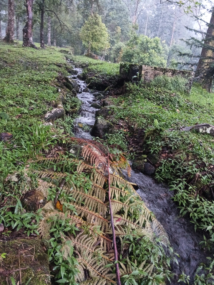 A stream runs through a lush, green forest. Water cascades over rocks and around vibrant ferns, flowing downhill. Trees line the hillside, with a small concrete structure partially obscured by foliage. The scene is damp, likely after a rain, contributing to the rich, verdant colors.
