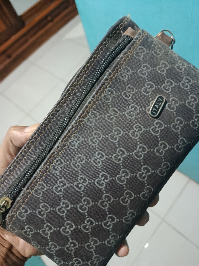 - "A dark brown wallet or clutch, patterned with a repetitive light grey "GG" monogram and featuring a metallic "ITALY" plaque, is held by a person's left hand" by FM-Sgztu1, licensed under CC BY 4.0