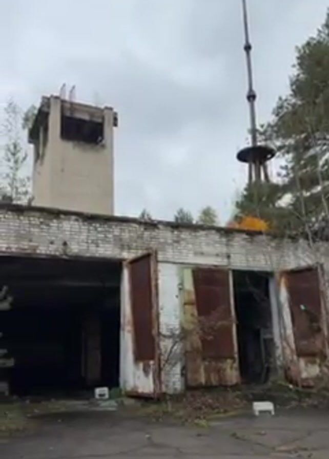 exterior of an abandoned, dilapidated brick building. The building has multiple garage-like openings with large, rusty doors. A tower structure is attached to the side of the building. There are young trees and shrubs growing on the roof and around the base of the building. A tall metal tower extends above the building. The sky is overcast. The video appears to be taken on a cloudy day.