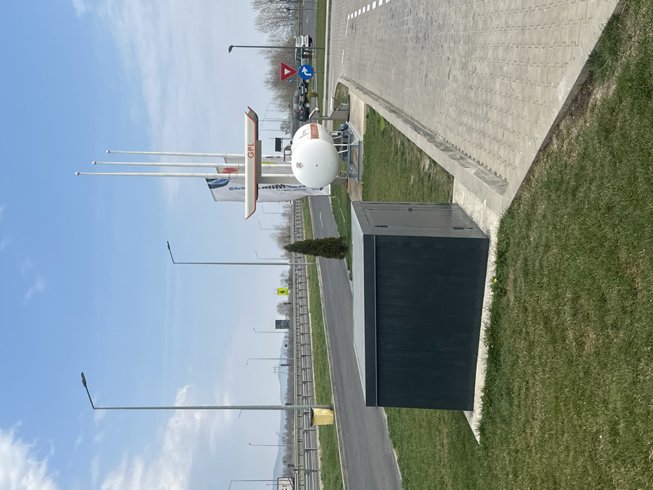 The image depicts an outdoor scene at an autogas fueling station adjacent to a highway, located in Orăștie, Romania. The sky is light blue with scattered white clouds, indicating clear weather conditions during daylight hours. In the foreground, a patch of green grass occupies the left and bottom sections. Situated on this grass is a dark grey, rectangular utility or storage box, mounted on a concrete slab. To its right, a paved area constructed from interlocking light grey pavers features white painted lines, delineating a path or parking space. A small, conical evergreen tree stands on the grass between the utility box and the fueling station. The midground features the autogas fueling station. A prominent structure consists of a red and white horizontal canopy with "GPL" (LPG) written in red, supported by three tall, white poles, which resemble flagpoles. Beneath this structure, a large white cylindrical liquefied petroleum gas (LPG) storage tank, labeled "GPL" and "autogas" in orange, rests on a metal platform. A black fuel dispenser is partially visible to the right of the tank. To the left of the fueling station, a two-lane paved road runs horizontally, bordered by a metal crash barrier. Numerous tall, grey streetlights are positioned along this road and extending into the background. A yellow garbage bin is visible near the left edge of the road. Vehicles, including passenger cars and a white van, are visible on the road and in a distant parking area, but no individuals are identifiable. A red triangular "yield" sign and a blue circular "mandatory direction" sign are present near the fueling station entrance. A yellow rectangular sign and a distant sign with a Ferrari logo are visible across the highway. The background shows a distant landscape with a line of bare trees, possibly indicating early spring or late autumn, and hills or mountains beneath the horizon. Power lines or infrastructure are also faintly visible in the far distance.