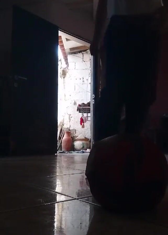 A person in a white shirt and dark pants is kicking a red and black soccer ball on a tiled floor. The person is standing in a room with an open door leading to a brighter outdoor area with a brick wall and various objects. The room itself is relatively dark, making the person's silhouette more prominent against the light.