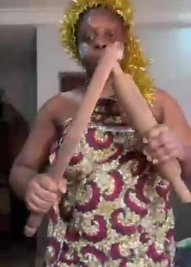 A person stands indoors facing the camera, holding and striking together two rolling pins. The person is wearing a colorful patterned cloth wrapped around the torso and a gold tinsel-like decoration on the head. There appears to be white powder on the person’s face. The background includes a partially visible door and a pink and white striped bed.