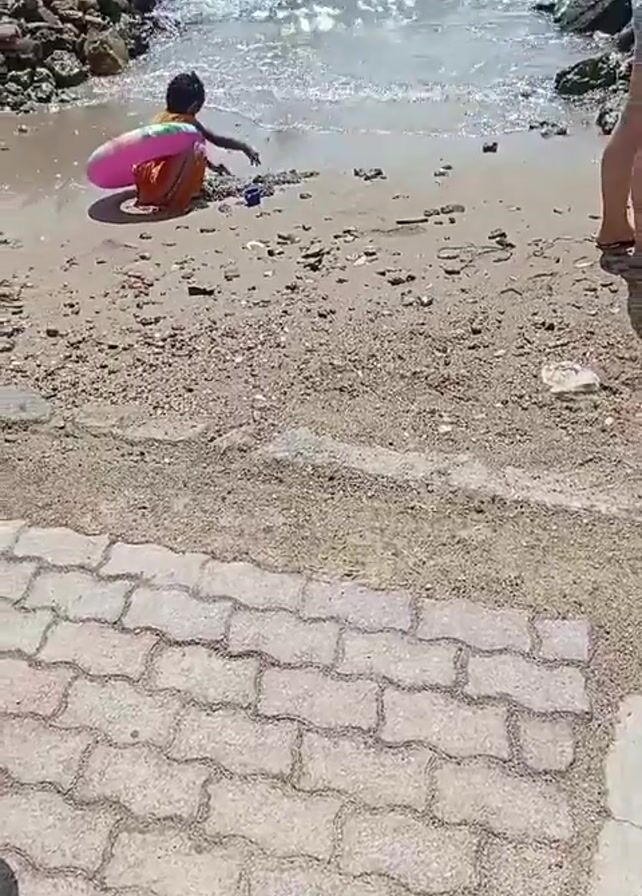 beach scene on a sunny day. Several children are playing in the water, with at least four visible in the sea. A young child wearing an orange top sits on the beach, playing with the sand and a pink inflatable ring. A woman is standing on the right side of the frame, watching the children. In the background, there are boats on the water and a clear sky with some clouds. The beach is rocky and sandy, and there is a vehicle or structure to the left, with its side mirror visible in the frame. The water appears calm, and the children seem to be enjoying themselves.