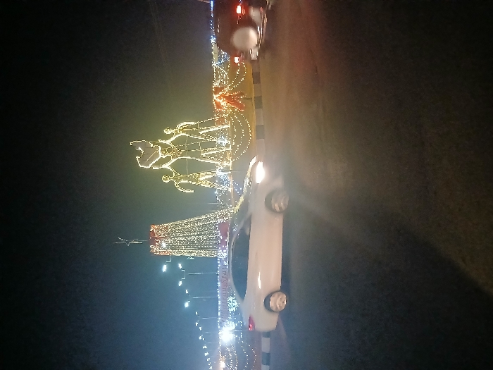 Nighttime road scene displaying festive illuminations. Strings of lights form a tower-like structure and human-like figures. A white car drives along the road, illuminated by headlights. The background is a dark sky, with additional streetlights adding to the overall ambiance.