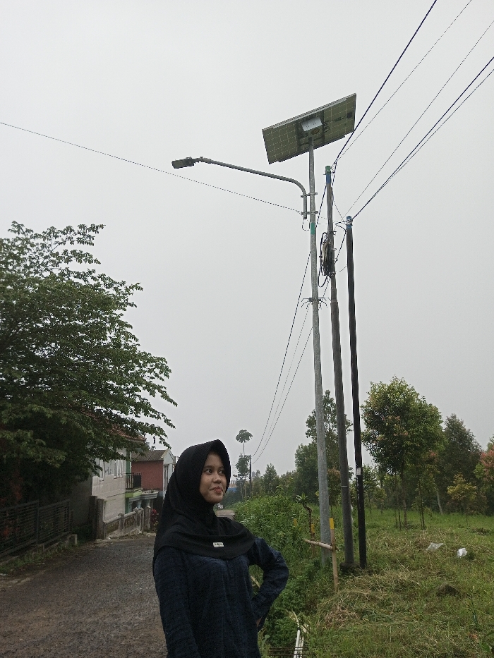 The image depicts a semi-rural or hilly residential street in Unknown, Vietnam, under an overcast sky. A young woman is positioned in the lower-left to mid-left frame, facing slightly right with a faint smile, her left hand resting on her hip. She is wearing a black hijab and a dark, patterned long-sleeved top. To her left, an unpaved road leads past a light-colored residential building with a dark fence, and a smaller red structure partially visible behind it. A large, leafy green tree dominates the far left. In the mid-right, a metal utility pole supports a street light with an extended arm and an angled solar panel mounted above it. Multiple electrical or communication wires span the upper frame, connecting to this pole and two additional darker utility poles to its right. Coiled wires are visible on the main utility pole. The ground to the right of the road is overgrown with grass and various green vegetation. The background features dense green and some reddish-foliage trees, with distant, tall, sparse trees visible against the uniformly grey, hazy sky.