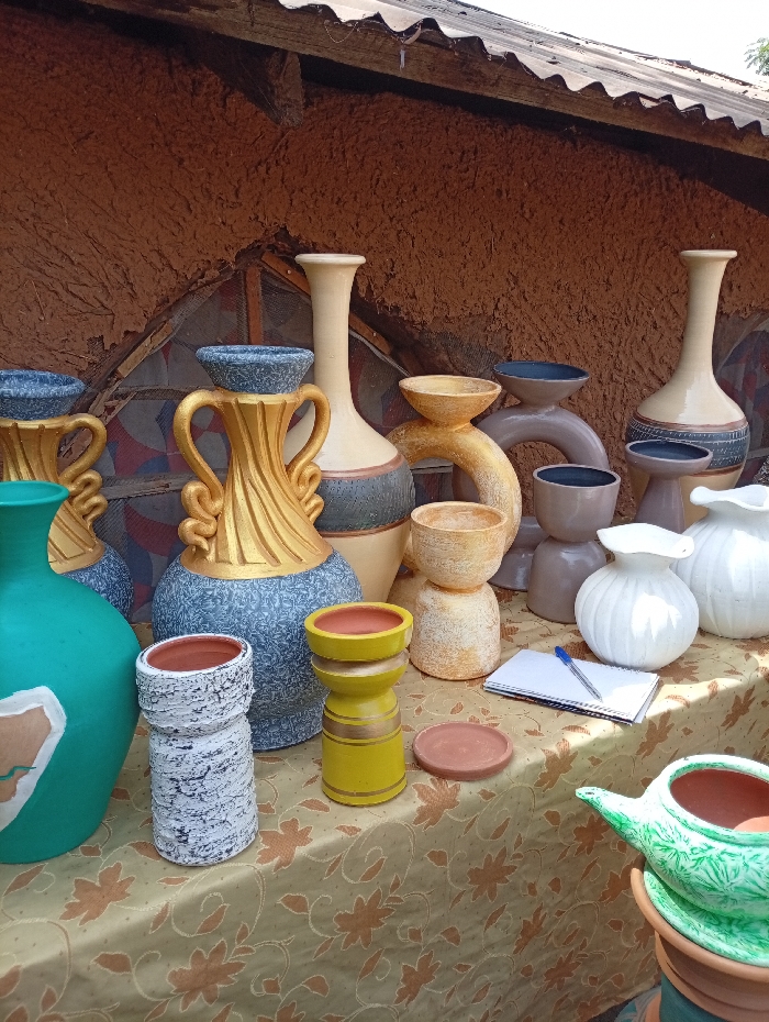 This image depicts an outdoor retail display in Unguwar Shanu, Nigeria. Approximately 18-20 distinct pottery items, including vases, planters, and decorative pots, are arranged on a table covered with a beige fabric tablecloth featuring a repeating dark brown floral motif. The pottery exhibits a variety of forms, sizes, colors, and textures; examples include tall, slender vases in cream and beige, shorter, textured grey-blue and gold-accented pieces, and a teal vase. Several pieces feature rough, pitted textures or horizontal banding. A green, stylized teapot-shaped planter is visible in the lower right, and a small, round terracotta saucer rests on the tablecloth. A white spiral-bound notepad with a blue ballpoint pen on top is situated near the center-right. The background consists of a rustic, heavily textured wall constructed from reddish-brown mud or clay plaster, topped by a weathered, light-colored corrugated metal roof. The scene is illuminated by direct sunlight. No individuals are visible.