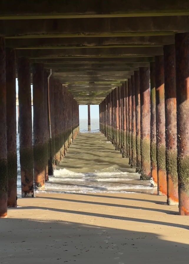 view from underneath a pier, looking out toward the ocean. The pier's support columns are lined up in rows, appearing rusty and partially covered with seaweed or algae. The waves are visible between the columns, gently lapping at the sandy beach. Shadows from the pier structure create a linear pattern on the sand. The light is bright, illuminating the scene from the far end of the pier. There is a strong wind sound.