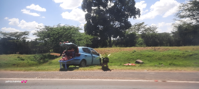 A light blue car with its hatchback open sits on the side of the road. The hatchback is filled with red fruit, overflowing onto a small blue table next to the car. To the right, there is a potted plant. Beyond the car, there is a grassy hill leading up to a line of trees. The sky is blue with white clouds. "police kombo" with two pink heart emojis is written in the bottom left corner of the image.
