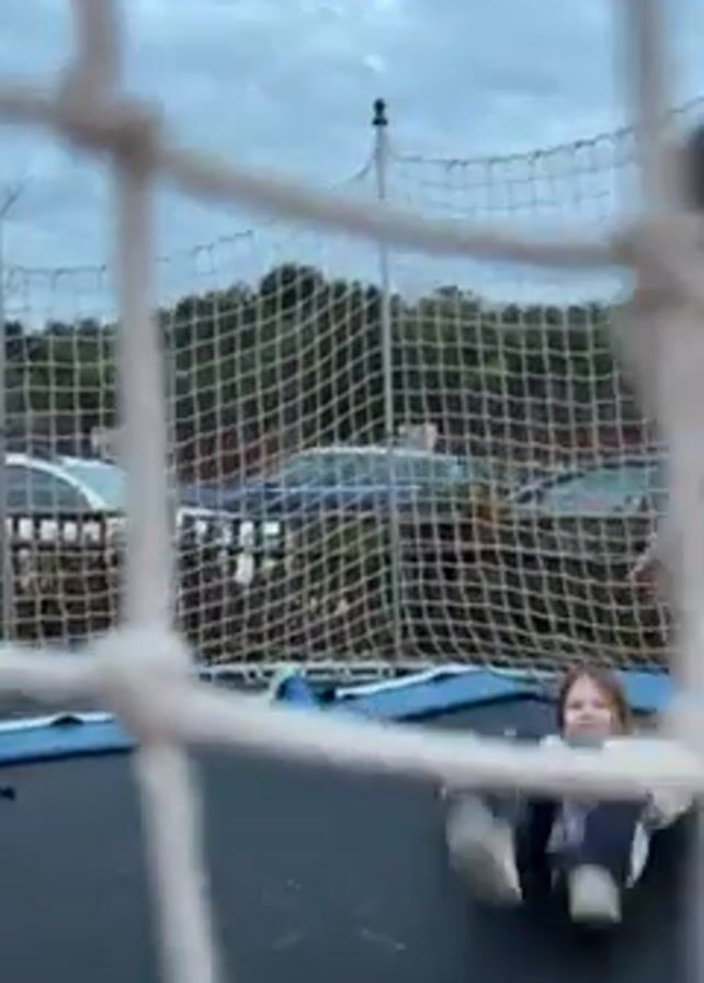 two children on a trampoline with a safety net. The younger child sits and bounces gently, while the older child stands and jumps. The trampoline is outdoors, surrounded by trees and parked cars visible through the net. To the side of the trampoline, there's a small pink playhouse and a wooden gazebo-like structure. The sky is overcast. The video is shot through an opening in what appears to be a fence or structure, partially obstructing the view.