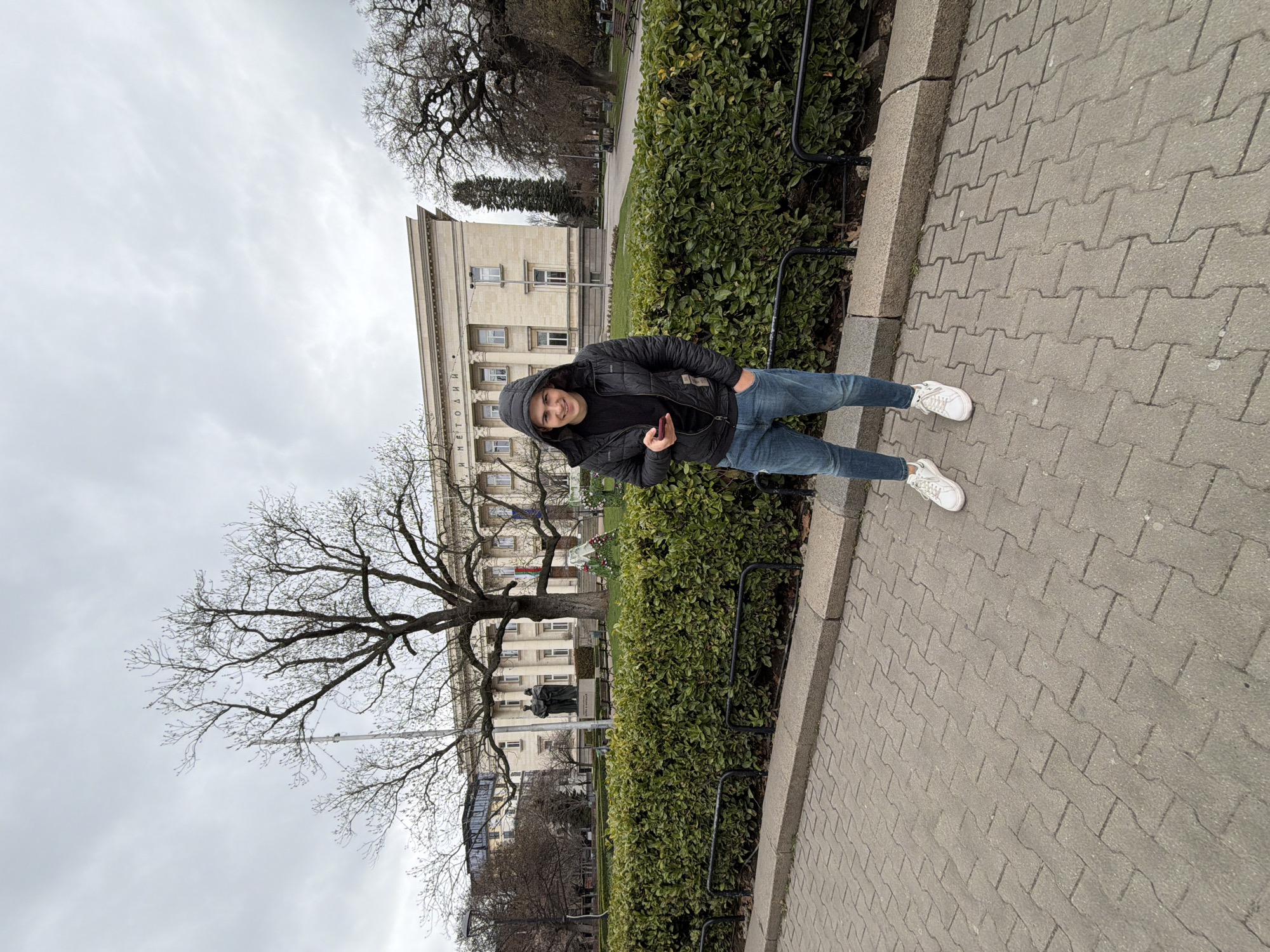 A person stands on a paved walkway in Sofia, Bulgaria, next to a hedge. The person is wearing a dark jacket, blue jeans, and white shoes. A large bare tree is to the left. In the background is a light-colored stone building. A statue is in front of the building, behind the hedge. The sky is overcast.