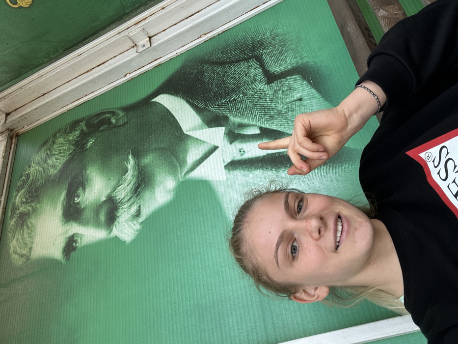 The image captures a young, light-haired woman positioned in the foreground, smiling towards the camera, against a large green monochrome portrait in Simitli, Bulgaria
